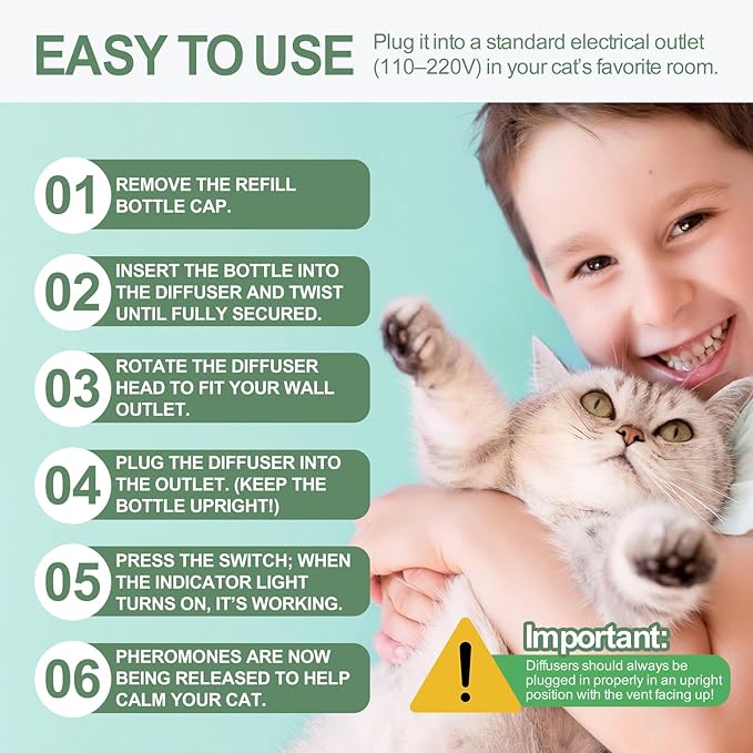 - 【Simple & Safe to Use】Non-toxic and easy to install, plug the diffuser upright into outlets in rooms where cats spend the most time; avoid enclosed or obstructed areas for optimal results.