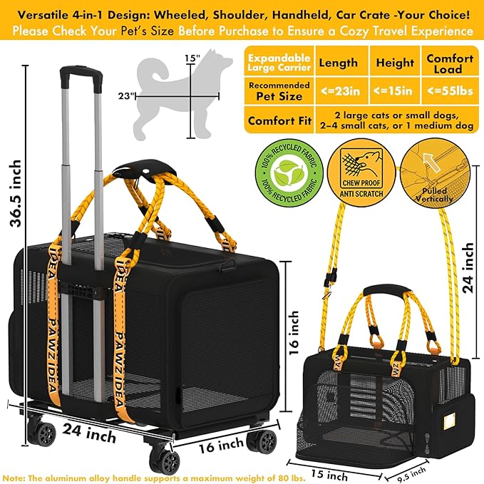 PAWZIDEA Expandable Large Pet Carrier with Wheels, 24x16x16 in Rolling Cat Carrier for 2–4 Cats up 55lb, Soft-Sided Collapsible Small Medium Dog Crate for Car Travel, Telescopic Handle, Storage Pocket