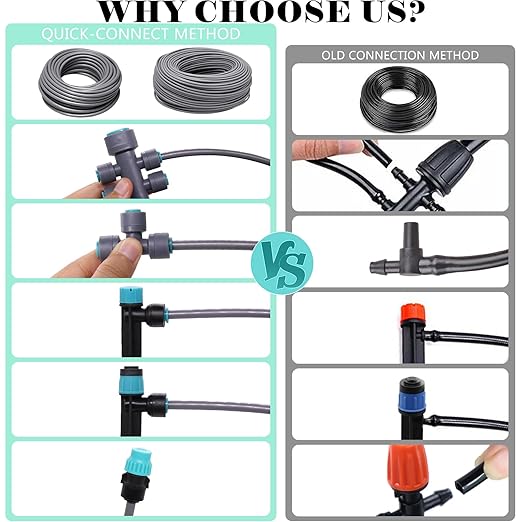 - 【Plug & Play with Quick Connect Design】Say goodbye to complicated installations—this drip irrigation system features quick-connect fittings that snap together effortlessly, ensuring a leak-proof and secure connection. The included six-way, and tee connectors allow you to design the perfect layout for raised beds, potted plants, or greenhouse irrigation systems.