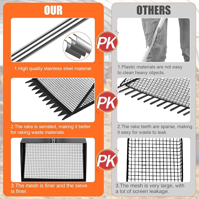- 10'' Wide Full Metal Material - The chicken coop poop scooper rake for sand is 10" wide shovel surface with the curved design. So it can not only scoop up chicken litter effortlessly by fitting closely to the ground, but also increase the capacity of the chicken coop shovel. You can clean a large area at a time, saving time and increasing efficiency. Made of heavy-duty metal stainless steel, the upgraded thickened pole of sifting shovel & rake for chicken coop can even hold 10lb scraps for long-term use, no bends or deform