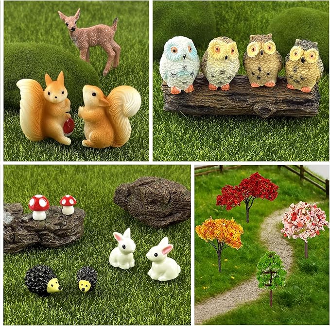 - Miniature Garden Decor: Includes 3 Artificial Tree Stumps, 4 Miniature Fake Stone Rocks, 4 moss packs (10g each), 6 trees, 4 owls, 2 rabbits, 2 hedgehogs, 8 mushrooms, and 1 deer—ideal for fairy gardens, bonsai, potted plants, and tabletop displays