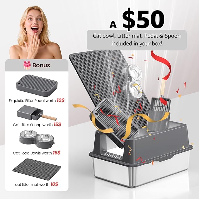 - 【UPGRADED DESIGN, DOUBLE CAPTURE】Our metal litter box now features a refined pedal with a built-in litter mat for enhanced litter trapping, plus an added cat bowl for convenience. The redesigned footboard ensures easy access for all cats, from kittens to seniors, making it perfect for their natural habits. It’s a smarter, cleaner solution for your feline friend!