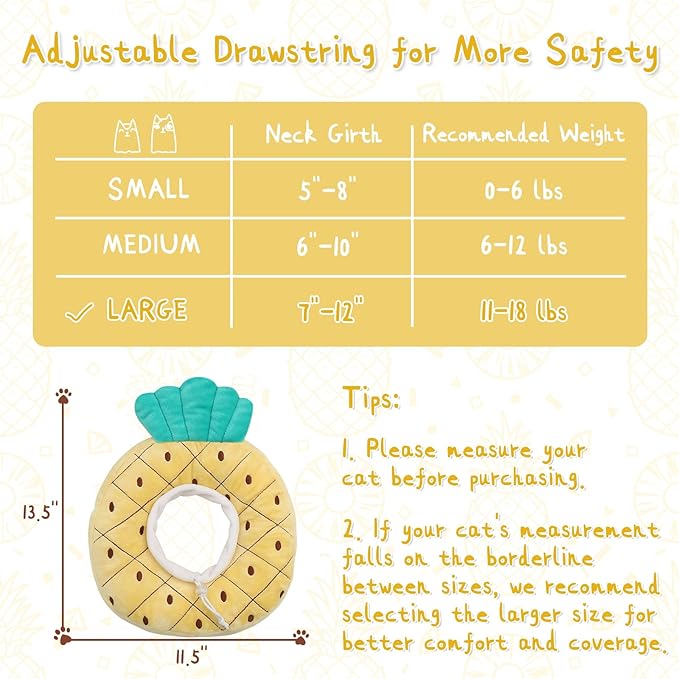 • 【SUITABLE FOR ALL SIZE OF CATS】 Soft cone for cats has an adjustable inner, so you can make a comfortable fit for your cat. By adjusting the stretchy string, cat won’t slip out of it that easily. Available in three sizes. Size L (11.5"×11.5") suitable for cats with a neck circumference of 7-12 inches (11-18 pounds cats recommended).