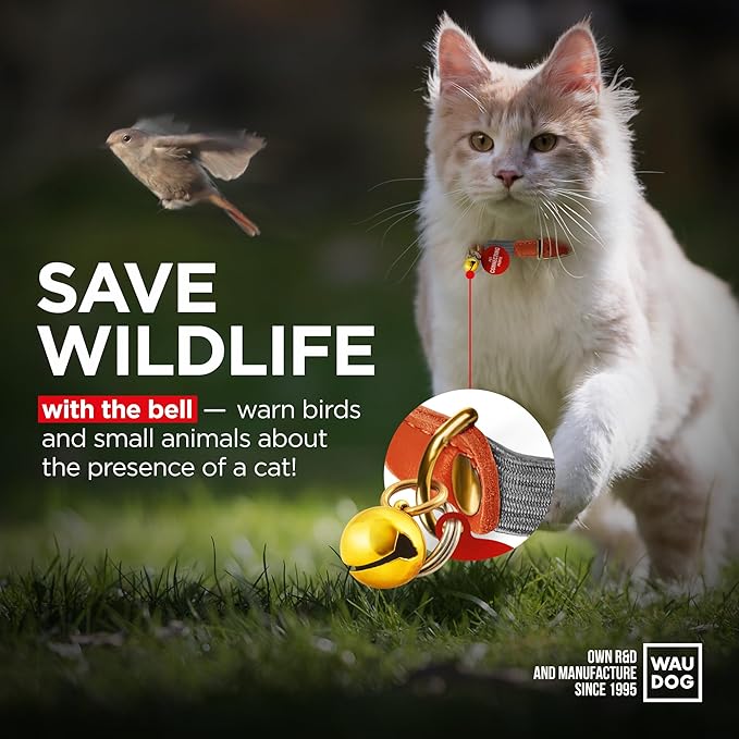 WAUDOG Ultra Soft Rolled Leather Cat Collar with Removable Bell, Safety Elastic Strap and QR ID Tag - Soft Padded for Small, Medium, and Large Cats - Round Kitten Collar for Male and Female Cats