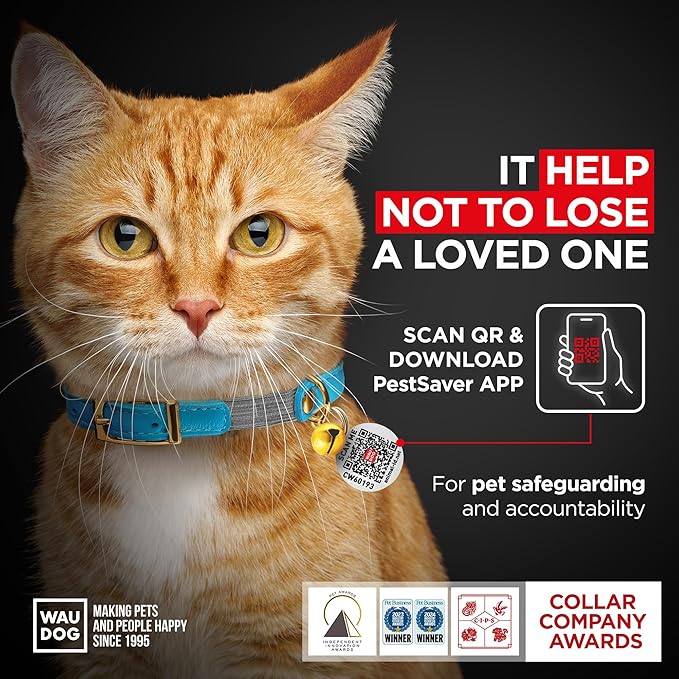 WAUDOG Ultra Soft Rolled Leather Cat Collar with Removable Bell, Safety Elastic Strap and QR ID Tag - Soft Padded for Small, Medium, and Large Cats - Round Kitten Collar for Male and Female Cats