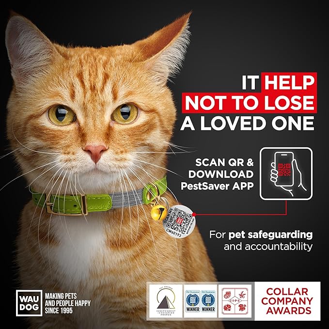WAUDOG Ultra Soft Rolled Leather Cat Collar with Removable Bell, Safety Elastic Strap and QR ID Tag - Soft Padded for Small, Medium, and Large Cats - Round Kitten Collar for Male and Female Cats