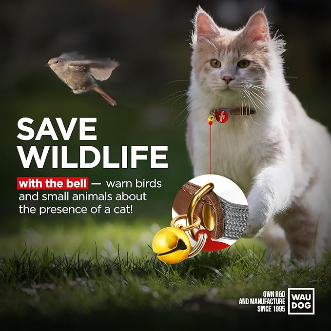 WAUDOG Ultra Soft Rolled Leather Cat Collar with Removable Bell, Safety Elastic Strap and QR ID Tag - Soft Padded for Small, Medium, and Large Cats - Round Kitten Collar for Male and Female Cats