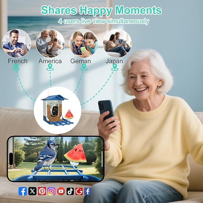 - Dual power system with solar panel + 5200mAh battery ensures 365-day operation. IP65 waterproof roof protects camera and seeds from rain/snow. No more frequent charging or weather worries!The app of outdoor bird feeder can support multiple users and share lovely videos of birds on social media. It will strengthen communication between families, like our parents who always share the beautiful moments of birds