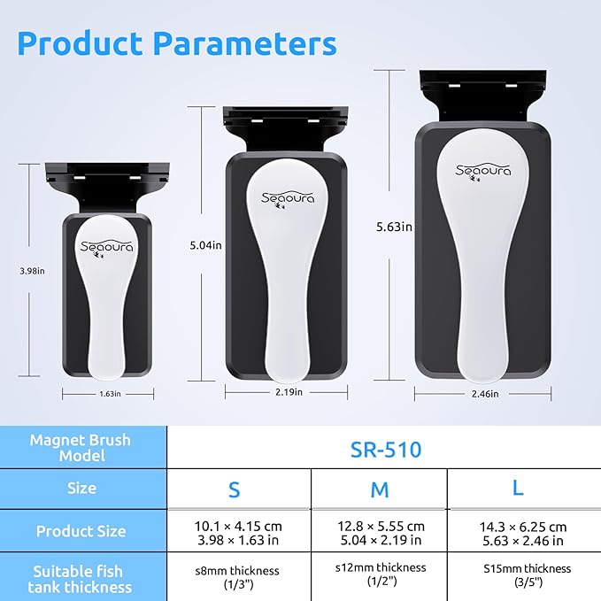 - Powerful Magnetic Hold for Effortless Cleaning: Experience seamless algae removal with our fish tank cleaner magnet robust magnetic coupling. Engineered with strong neodymium magnets, it maintains secure contact through thick aquarium glass(Tips: S Model: Ideal for glass up to 1/3" (8mm) thick. M Model: Designed for glass up to 1/2" (12mm) L Model: Heavy-duty capacity for 3/5" (15mm) glass).