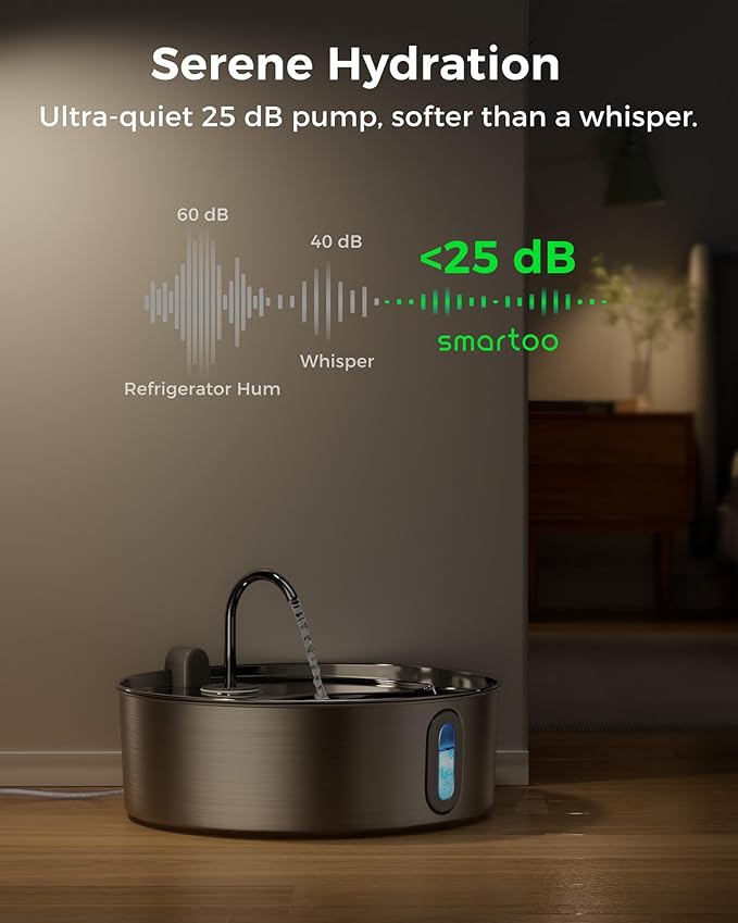 - Enjoy Peaceful Hydration - Our automatic water dispenser for dogs features an ultra-quiet pump that operates at just 25dB, which is softer than a breath and quieter than a whisper. It won't disturb your sleep, reading, or startle your pet