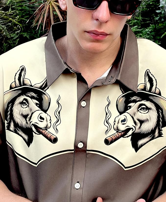 - DISTINCTIVE DESIGN: Features mirror-image prints of cigar-smoking donkeys wearing hats on a two-tone brown and cream colored panel, creating a unique western-inspired look