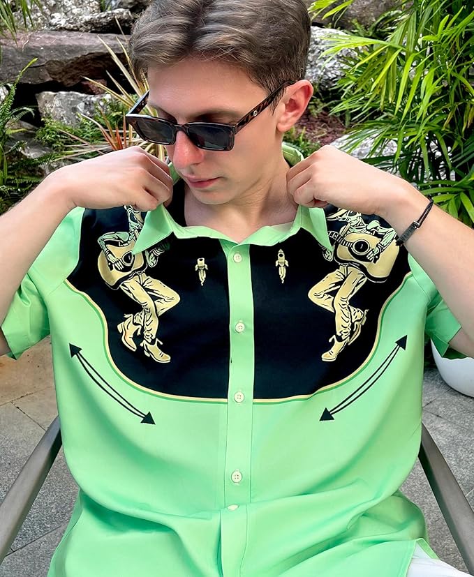 - UNIQUE DESIGN: Sage green button-down shirt featuring alien musicians with guitars print, creating a distinctive retro-inspired style with contrasting black panel design