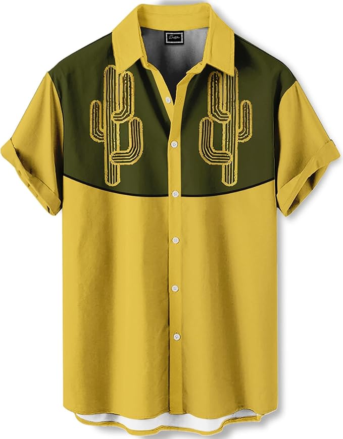 - RETRO WESTERN DESIGN: Distinctive yellow and olive green color-block shirt featuring embroidered cactus motifs on the chest panel for a unique southwestern aesthetic