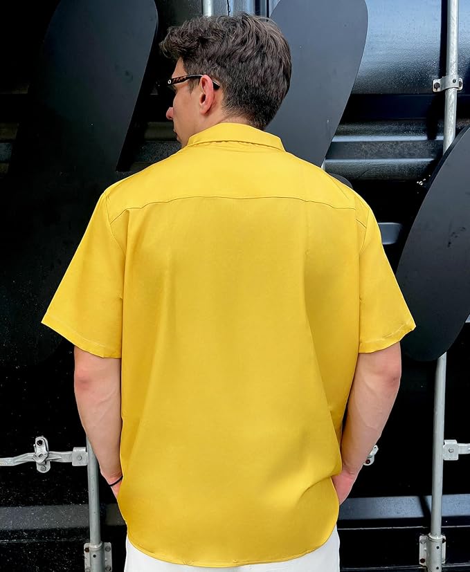 - QUALITY CONSTRUCTION: Button-down shirt crafted from durable polyester fabric with traditional collar, full-length button closure, and rolled short sleeves