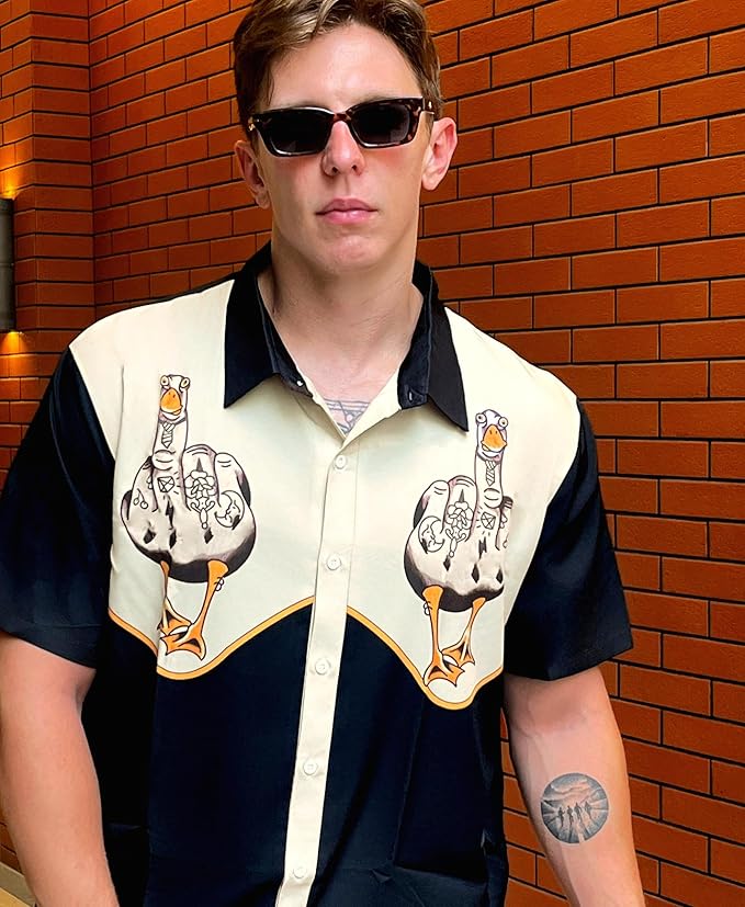 - FUNNY DUCK DESIGN: Unique duck you-themed button-down shirt featuring characters with funny duck on a light black and beige background