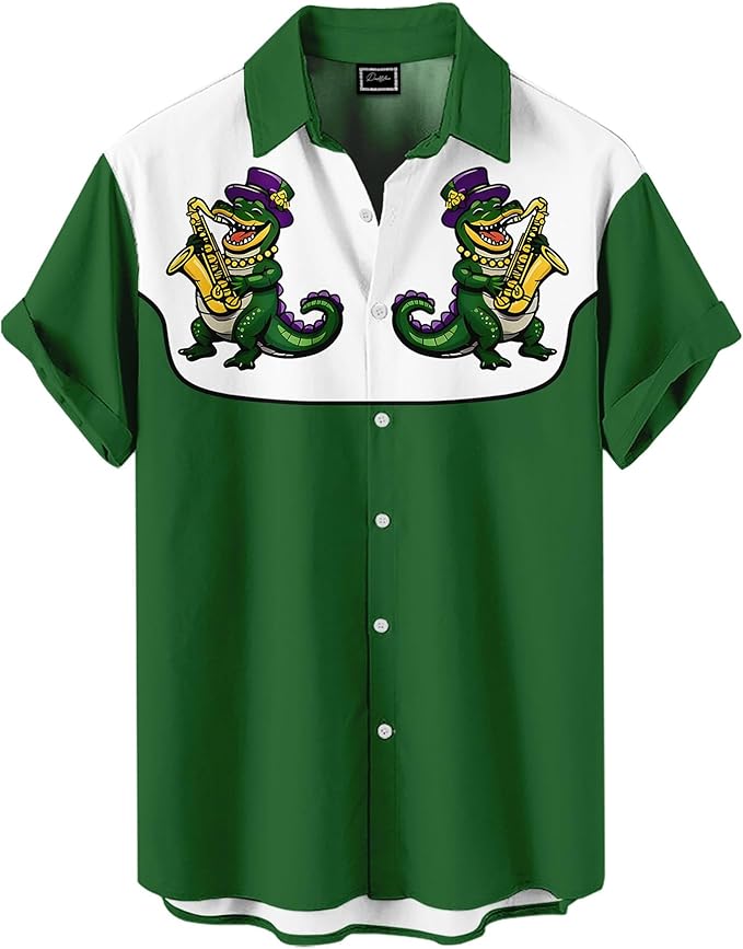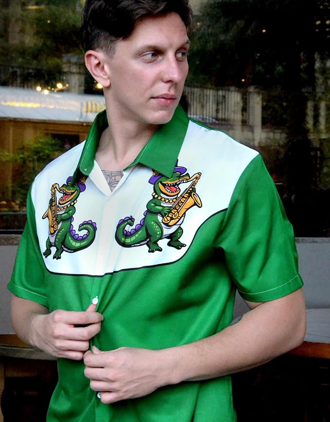 - DISTINCTIVE DESIGN: Green Hawaiian shirt with white yoke featuring playful alligator graphics with top hats and saxophones, creating a unique jazz-themed casual look