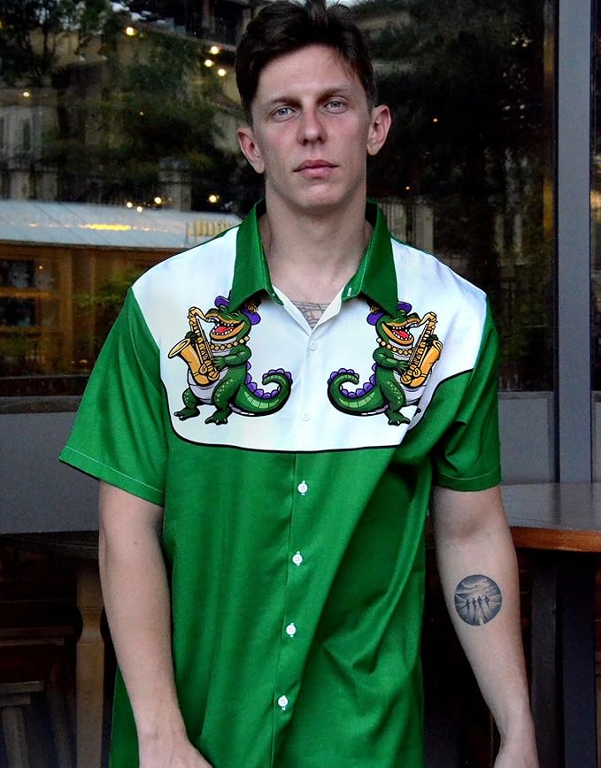 - DISTINCTIVE DESIGN: Green Hawaiian shirt with white yoke featuring playful alligator graphics with top hats and saxophones, creating a unique jazz-themed casual look