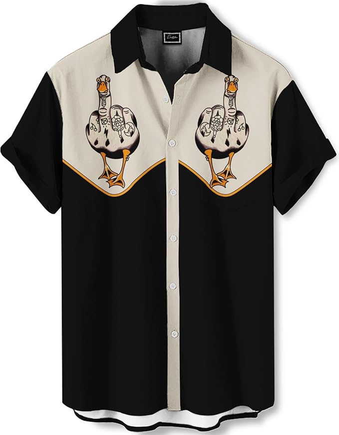 - FUNNY DUCK DESIGN: Unique duck you-themed button-down shirt featuring characters with funny duck on a light black and beige background