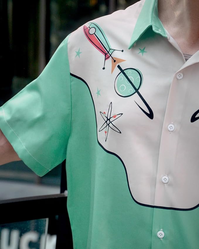 - RETRO SPACE DESIGN: Unique mint green button-down shirt featuring atomic age motifs with rockets, planets, and stars for a vintage sci-fi inspired look
