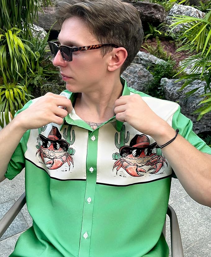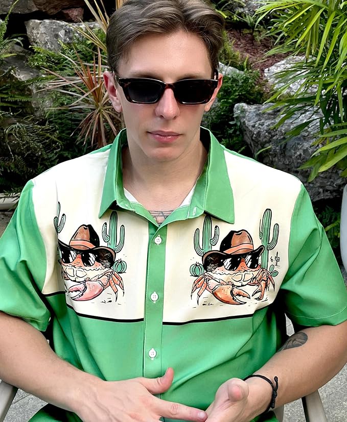 • WESTERN DESIGN: Unique button-down shirt featuring playful crab characters wearing cowboy hats and sunglasses against a desert cactus backdrop, perfect for making a bold fashion statement