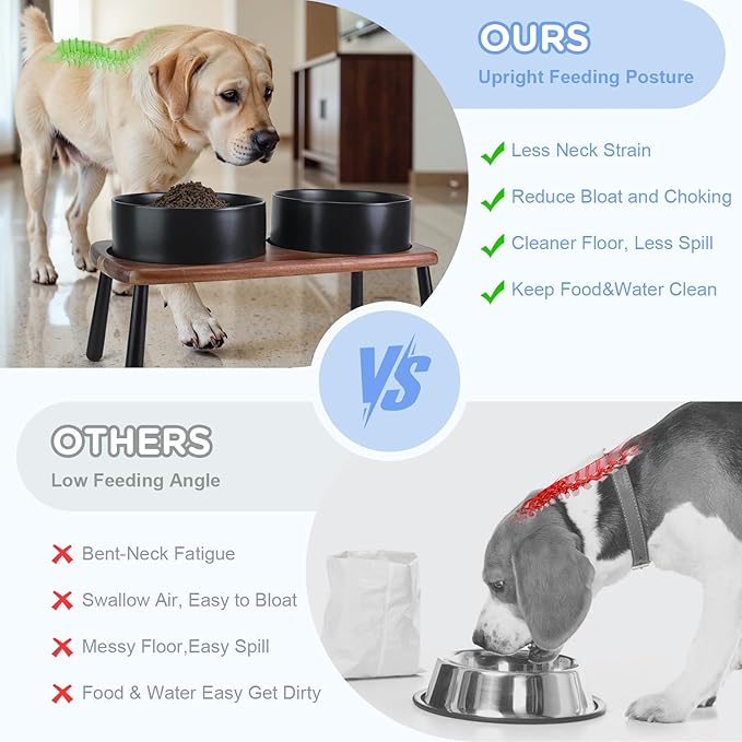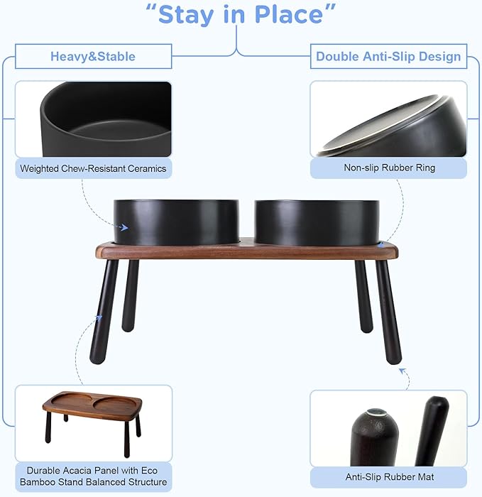 - Stable, Tip‑Resistant Design – A solid acacia wooden panel eco bamboo legs stand with Chew‑Resistant Heavyweight Ceramic, wide stance, and slip‑proof silicone pads join forces to create raised dog bowls that STAY IN PLACE on tile, wood, or laminate. Fewer spills mean cleaner floors and no accidental gouges or scratches or noisy