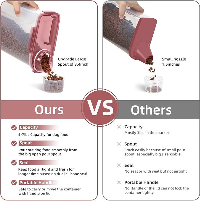 - Upgraded and Lmproved Versions:We have optimized and improved the mold the pour spout is large enough to pour out the big dog Food,You can pour out the food easy and fast now. The new upgraded Measuring Cup is also easy to screw on the spout now.The lid with snaps can also be easily closed on the barrel body.