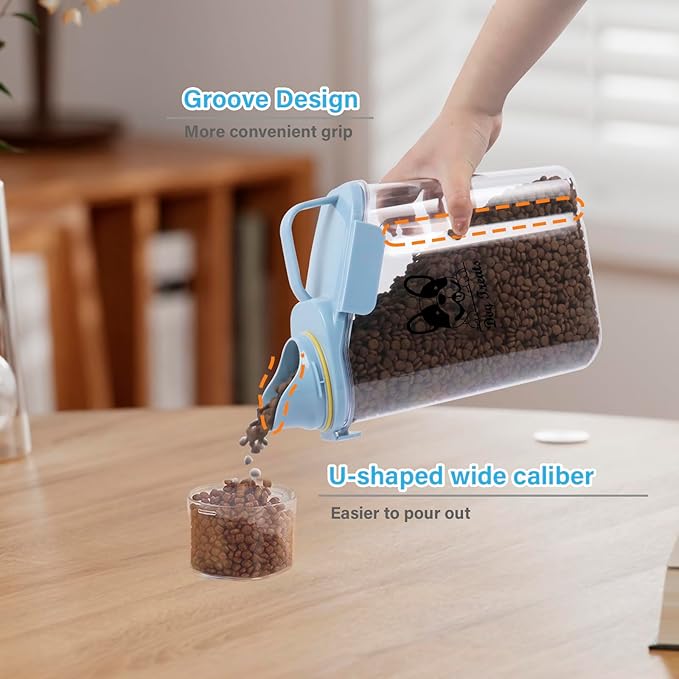 - 1.Multi function pet food bin:Biscuits,Treats, Kibbles. Keep your pet food organised and fresh in this dog food storage bin and enjoy every merry pouring feeling.With handle on the lid to help with heaving and hefting around,it is perfect for indoor, outdoor use.There's even a measuring cup making it easier for feeding times as well.