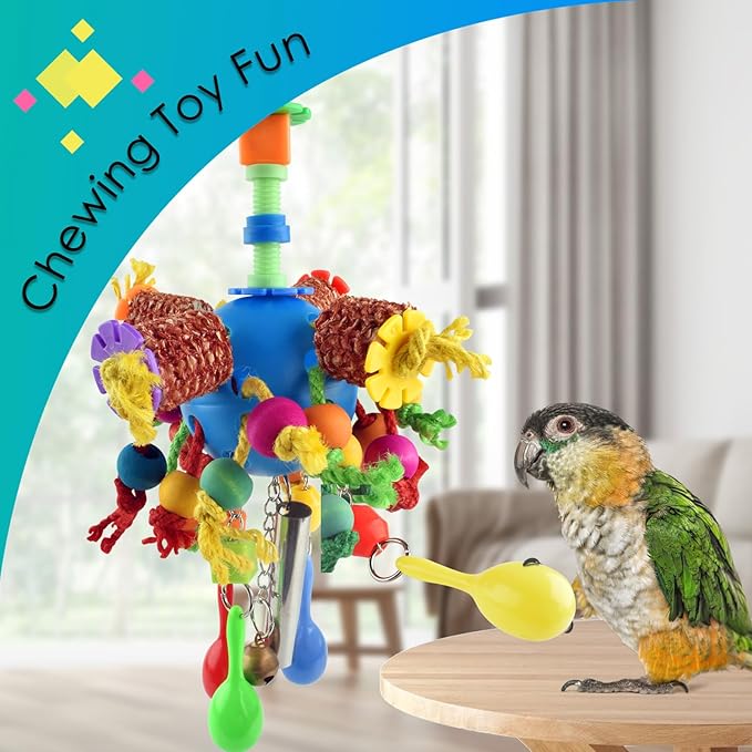 - MENTAL & PHYSICAL WORKOUT: Birds will spend hours to chew, forage, pull, scratch and shake the sand hammers, windchime or bell, let them crash into each other. Has colorful wooden beads and corn cobs to play with and bite. Offering your bird to enjoy vision, hearing, physical and mental pleasure at the same time