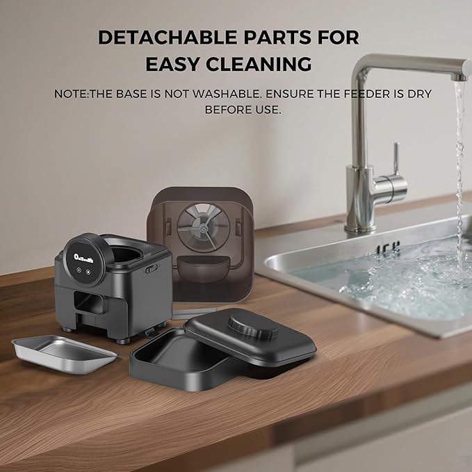 - Pet-Safe Design: Sealed Lid to Keep Food Dry The sealed lid keeps food dry and, when paired with a desiccant, prevents moisture. The removable stainless steel bowl is easy to clean, but the main unit is not washable. Wipe the unit with a dry cloth to clean.