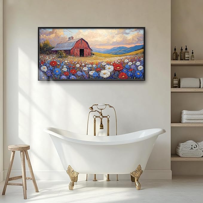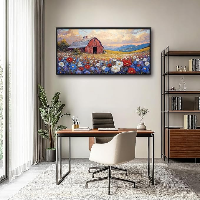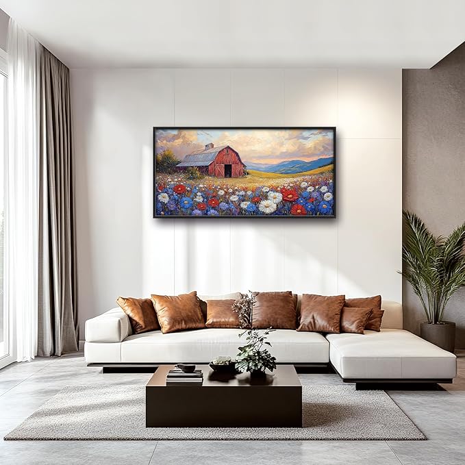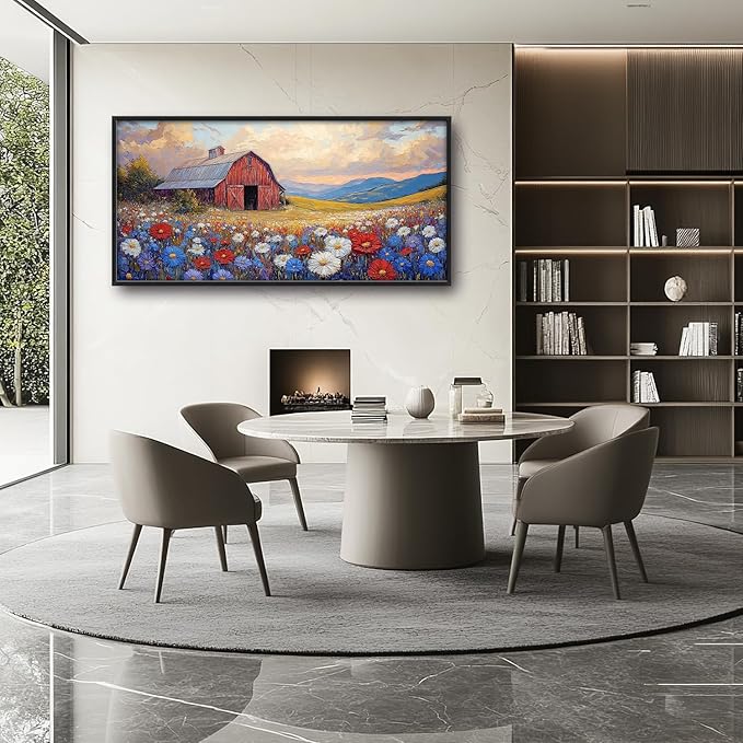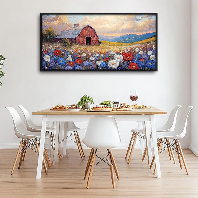 Large Farmhouse Barn Daisy Wall Art for Living Room, Floral Landscape Canvas Oversized Wall Decor, Flower Scenery Framed Pictures Painting Print Artwork for Bedroom Office 60"L x 30"W