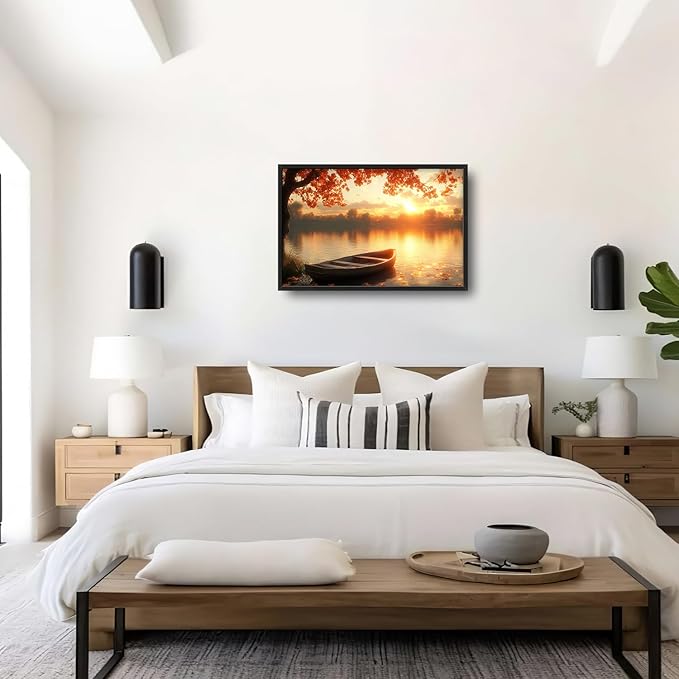 Large Lake Sunrise Landscape Wall Art for Living Room, Nature Boat Canvas Oversized Wall Decor, River Scenery Framed Pictures Painting Print Artwork for Bedroom Office 36"L x 24"W