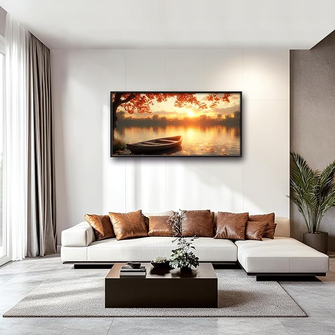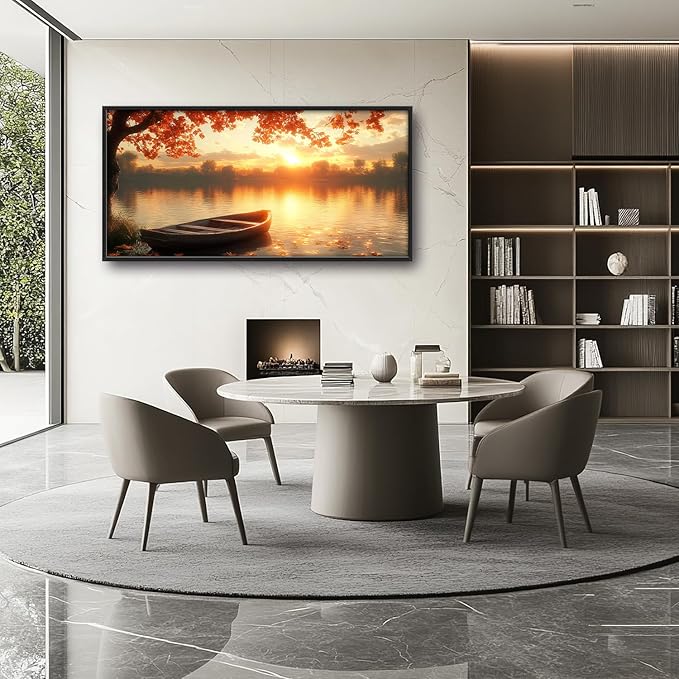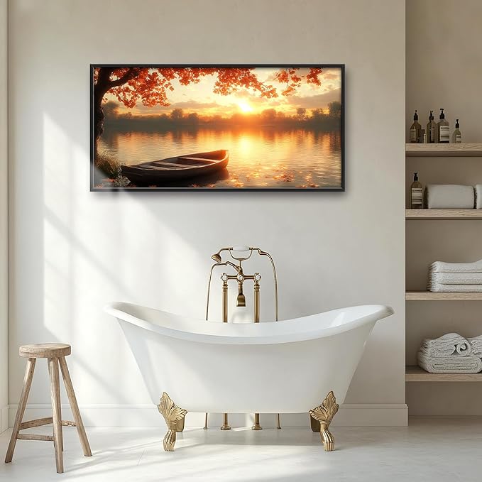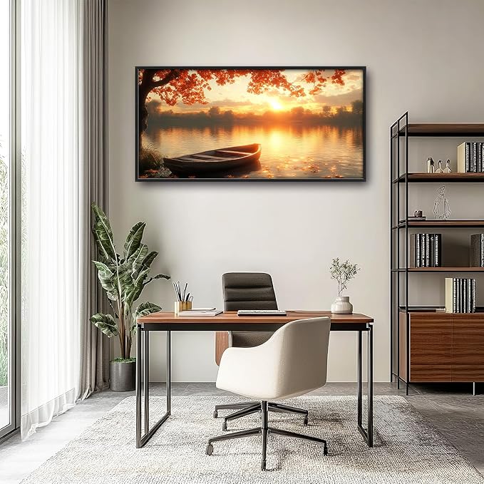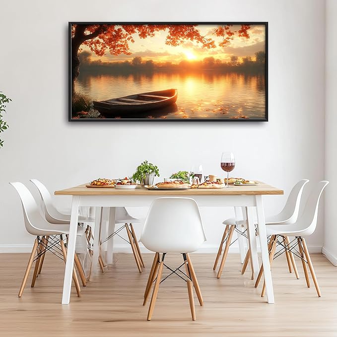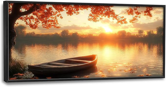 Large Lake Sunrise Landscape Wall Art for Living Room, Nature Boat Canvas Oversized Wall Decor, River Scenery Framed Pictures Painting Print Artwork for Bedroom Office 60"L x 30"W