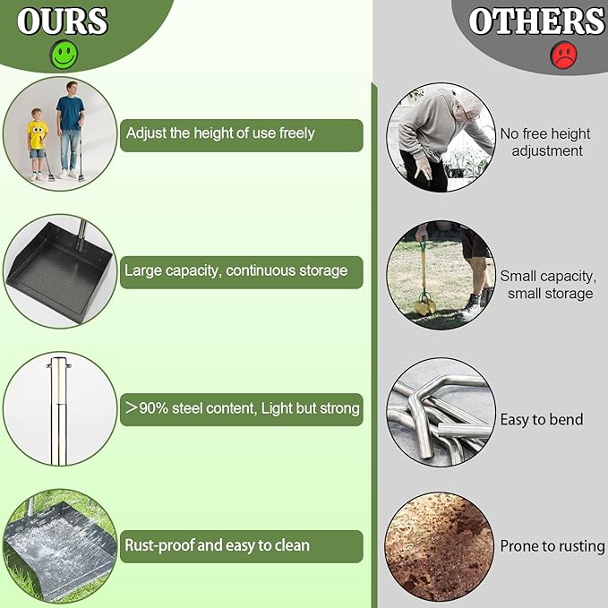- 【Durable & Rust Resistant】Our dog poop scooper is made of stainless steel metal to ensure its durability and sturdiness. The edges of the accessories are polished or wrapped in plastic to ensure safe use. The surface spraying process makes it easy to clean and rust proof in one step. After use, only rinse with clean water to reduce the use of garbage bags