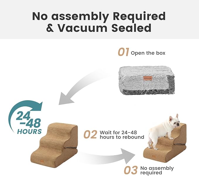 - No Assembly Required: The foam dog stairs for bed is convenient and hassle-free, simply unbox the pet steps, your furry friend can start using it right away. Due to vacuum compression, the surface of the puppy stairs may appear slightly wrinkled, and it will recover within 24-48 hours.