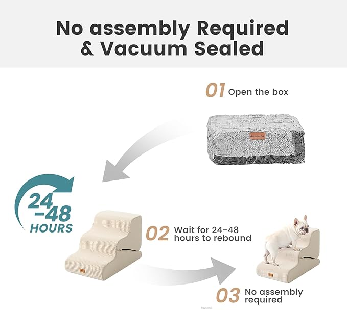 - No Assembly Required: The foam dog stairs for bed is convenient and hassle-free, simply unbox the pet steps, your furry friend can start using it right away. Due to vacuum compression, the surface of the puppy stairs may appear slightly wrinkled, and it will recover within 24-48 hours.