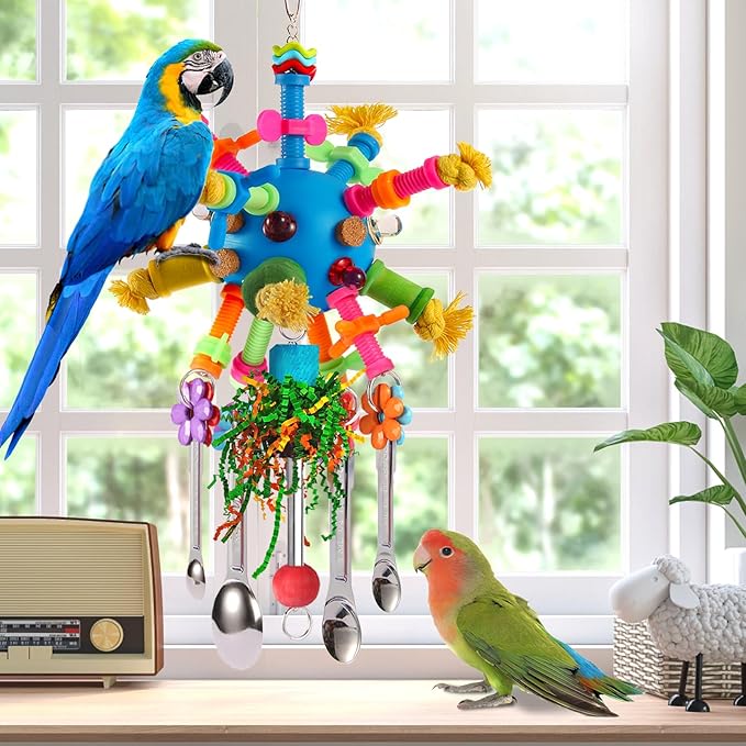 - ๐ Bird toys that captivate: YIXUND Parrot toys features four gleaming stainless steel spoons for bird that reflect light like tiny mirrors, paired with rustling crinkly paper, tinkling wind chimes,vibrant acrylic bird toys, and a blue holey ball for birds.This dazzling rainbow of colors and intriguing textures creates an irresistible visual spectacle inside the cage, instantly grabbing your feathered bird friend's attention.