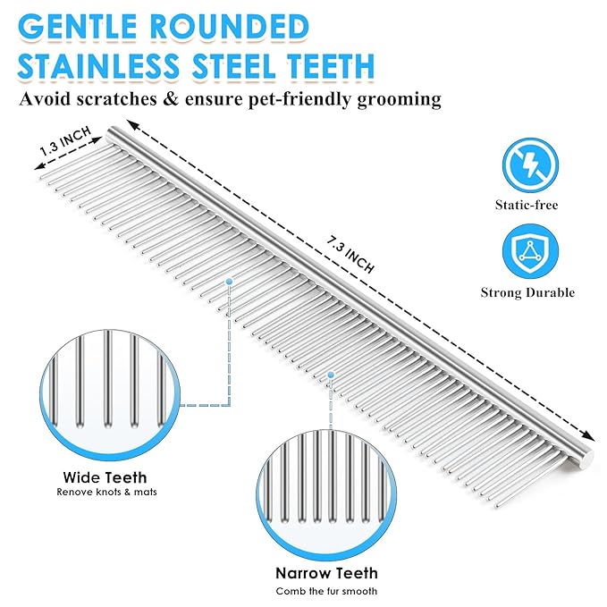 - Pro Grooming Duo: Start with the slicker brush to lift mats and loose fur from thick coats. Immediately follow with the stainless comb’s dual-width teeth to smooth the coat and remove residual hair from brush pins—complete grooming in half the time.