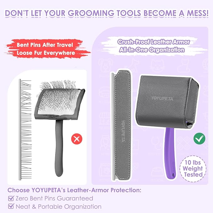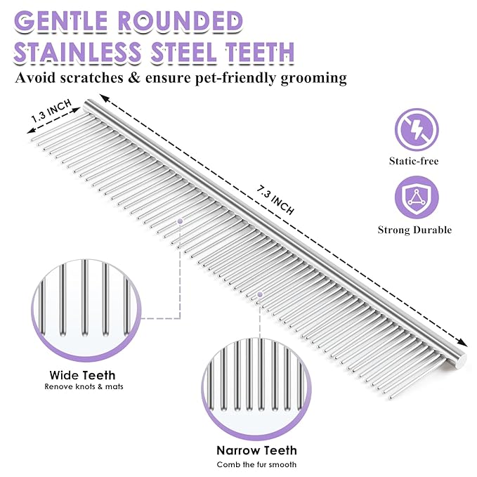- Pro Grooming Duo: Start with the slicker brush to lift mats and loose fur from thick coats. Immediately follow with the stainless comb’s dual-width teeth to smooth the coat and remove residual hair from brush pins—complete grooming in half the time.