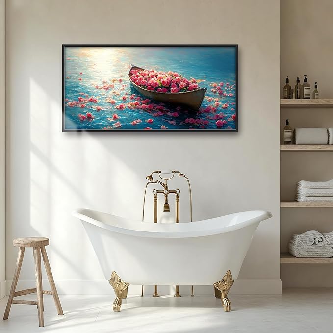 Large Lake Floral Landscape Wall Art for Living Room, Nature Boat Flower Canvas Oversized Wall Decor, Rose Scenery Framed Pictures Painting Print Artwork for Bedroom Office 60L" x 30W"