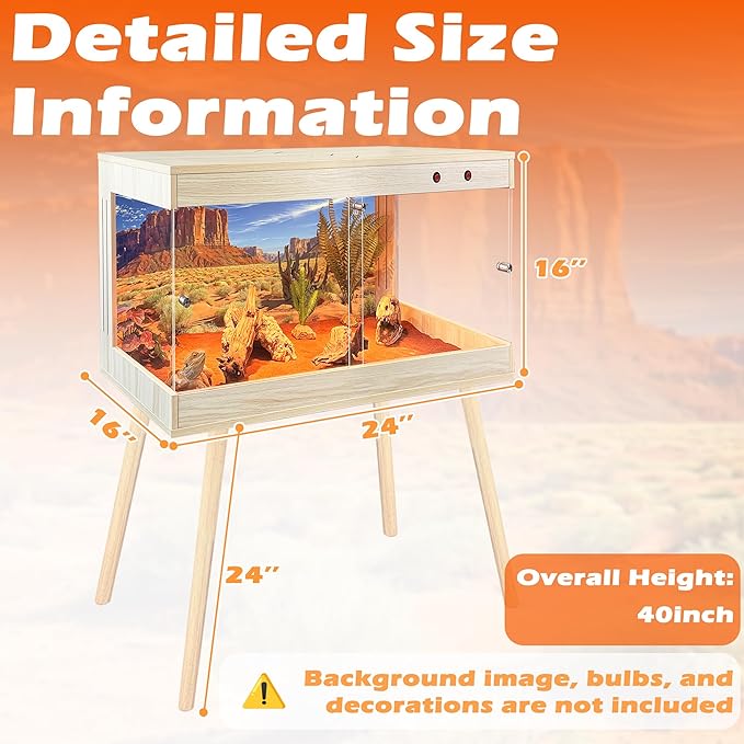- 【Premium Craftsmanship & Materials】Built with natural wood and strong tempered glass, this reptile terrarium combines strength with a sleek, modern look. The interior is coated with a water-resistant finish for long-lasting use, while the acrylic bottom panel ensures dependable moisture protection against spills and substrate buildup. Its roomy design provides ample space for your reptile to climb, bask, and hide—encouraging natural activity and supporting overall well-being. Available in 4 sizes, each enclosure comes with 4 sturdy legs (see image 2 for detailed dimensions).