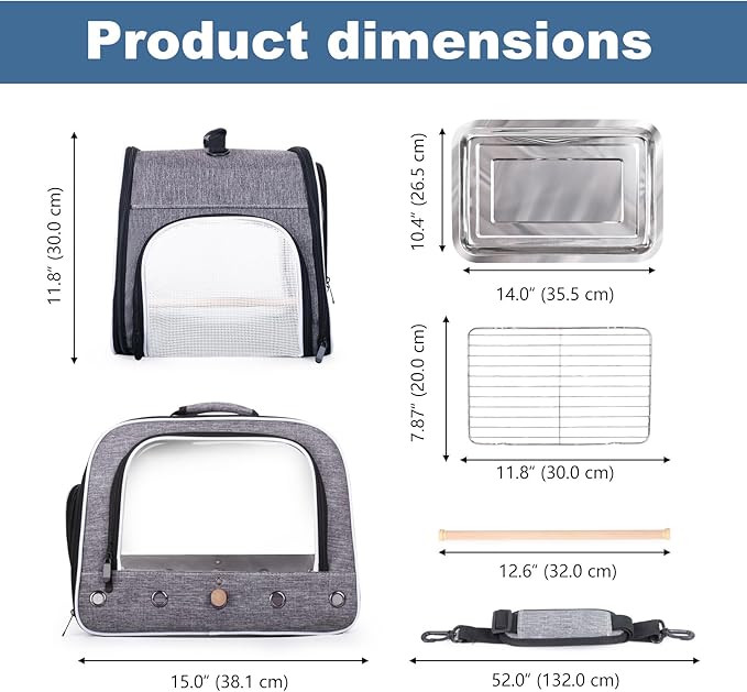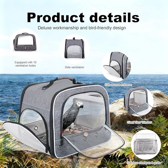 - PORTABLE DESIGN: Durable carrier with a sturdy top handle makes transportation comfortable and secure for both owner and bird, sling shoulder strap with padded to secure the carrier well. Great fit for small to large size of birds like parrot, parakeet, budgies, cockatiel with long tail, conure, African grey etc.