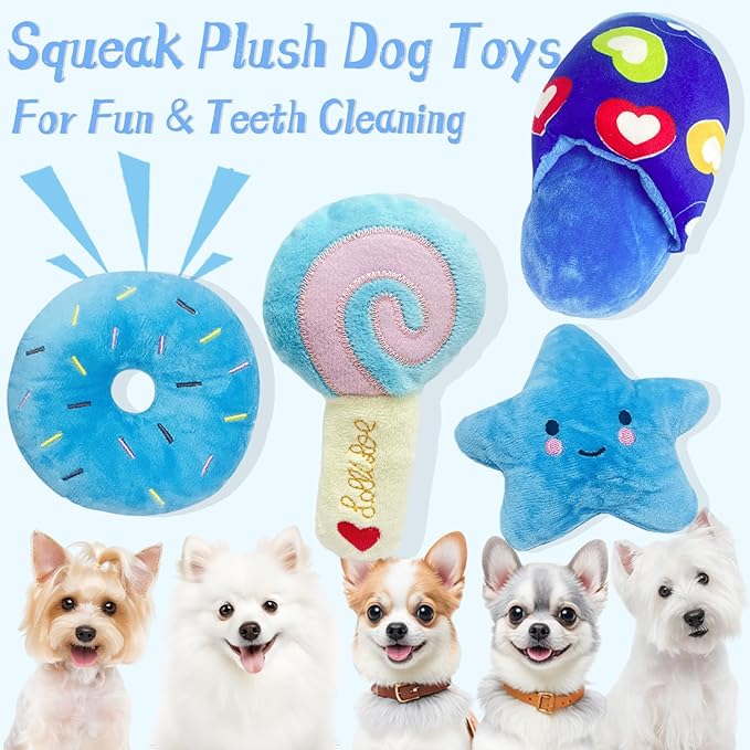 Dog Toys for Small Dogs, 4 Packs Cute Chew Toys for Puppy, Durable Soft Plush Interactive Small Dog Toys, Blue Stars Designs, Doggie Birthday Gifts