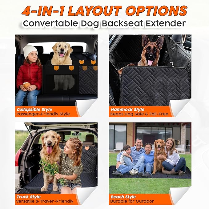 Back Seat Extender for Dogs Hard Bottom- Sturdy Dog Hammock for Car Hard Bottom Car Seat Cover for Dogs with Hair Remover, Seatbelt, Carrying Bag - Dog Backseat Cover SUV, Truck