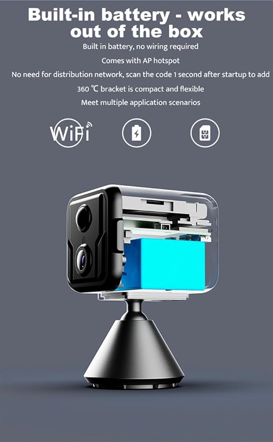 - MINI INVISIBLE+EASY INSTALLATION: security camera wireless Compact and portable (2.4 inches), with a hole free magnetic suction/screw fixed/desktop 3-purpose design, built-in battery, no wiring required, ready to use, configured in 5 minutes, suitable for various installation and application scenarios, home security (monitoring nanny/pet/child activities), shop anti-theft (preventing theft in small shops/warehouses), temporary needs (short-term monitoring for travel accommodation/rental housing)
