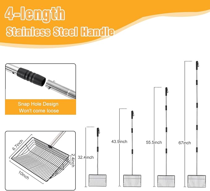 Chicken Poop Scooper 67 inch Adjustable Coop Scooper with 10 inch Metal Sieve for Fast Cleaning, Multi-Purpose Litter Tool for Chicken Coops, Barns & Pet Waste