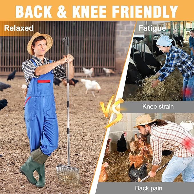 - Multi-Scenario Versatility – Perfect for chicken coops, barn cleaning, beachcombing (shell collection), leaf removal, and pet litter boxes. Doubles as a hay fork or sand sifter.
