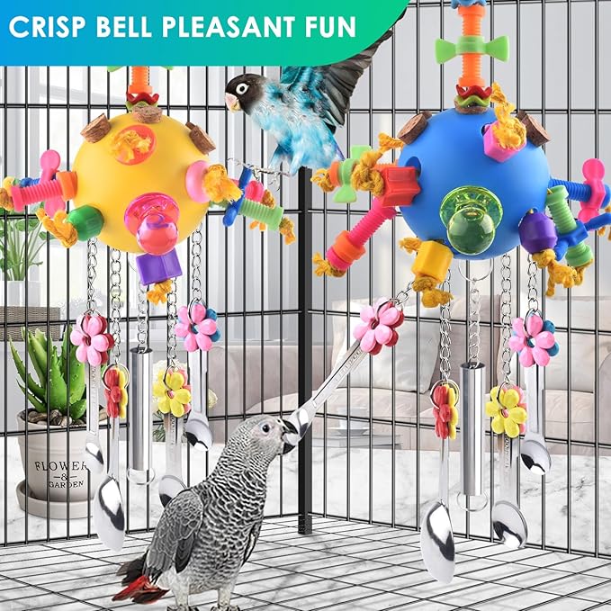 - INTERACTIVE TOY DESIGN: With sturdy spoons and bright wind chime that produce delightful sounds, and hollow design colored ball, surrounded with colored toys, captivating your pet bird's attention. And you can put some treats inside the ball for your bird to forage, add more fun