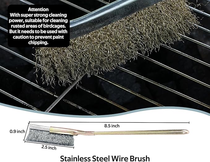 - 5 Pcs Birdcage Cleaner Kit: ④ Stainless steel wire brush (With super strong cleaning power, ideal for cleaning rusted areas of birdcages. But it needs to be used with caution to prevent paint chipping) ⑤ Mini dustpan & brush (for cleaning up the dust, feathers, feces, and other dirt that have been removed)