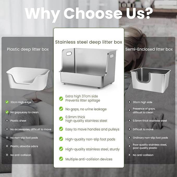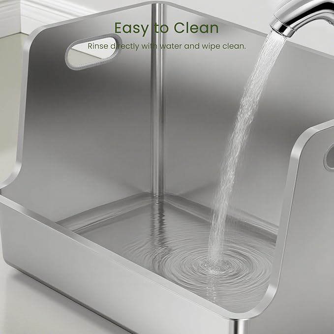 - No Odor & Easy to Clean: --The stainless steel material will not absorb any residue or odor, and the non-stick surface makes cleaning very easy, just a quick rinse and wipe with water to easily complete the cleaning. So, if you donβt like the odor of plastic cat litter boxes, but want easy cleaning, this stainless steel cat litter box is a great choice for you!