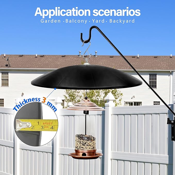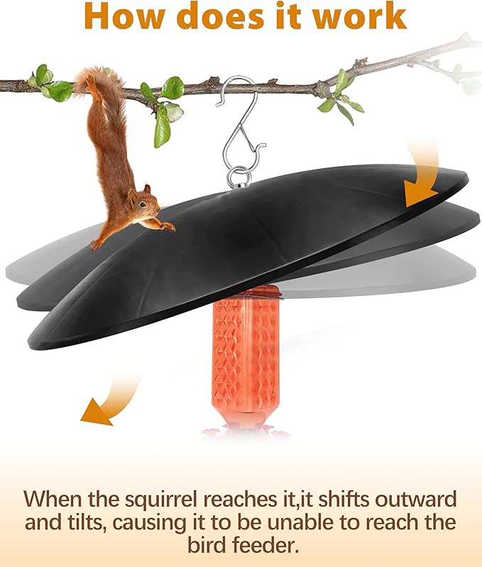 - 【19-inch oversized feeder protection banner】 After conducting research, we discovered that intelligent squirrels can bypass baffles with a smaller diameter. To make it more difficult for them to steal food, we increased the baffle's diameter to 19 inches. Typically, adult squirrels have an arm span of only 11–15 inches, so even if they spread their arms, they won't be able to reach the edge. Stop squirrels in their tracks and make your backyard safer!